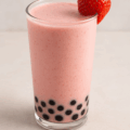 Creamy strawberry lassi with boba pearls—cool and refreshing!